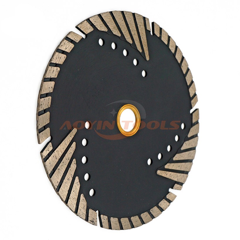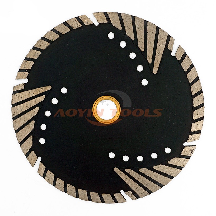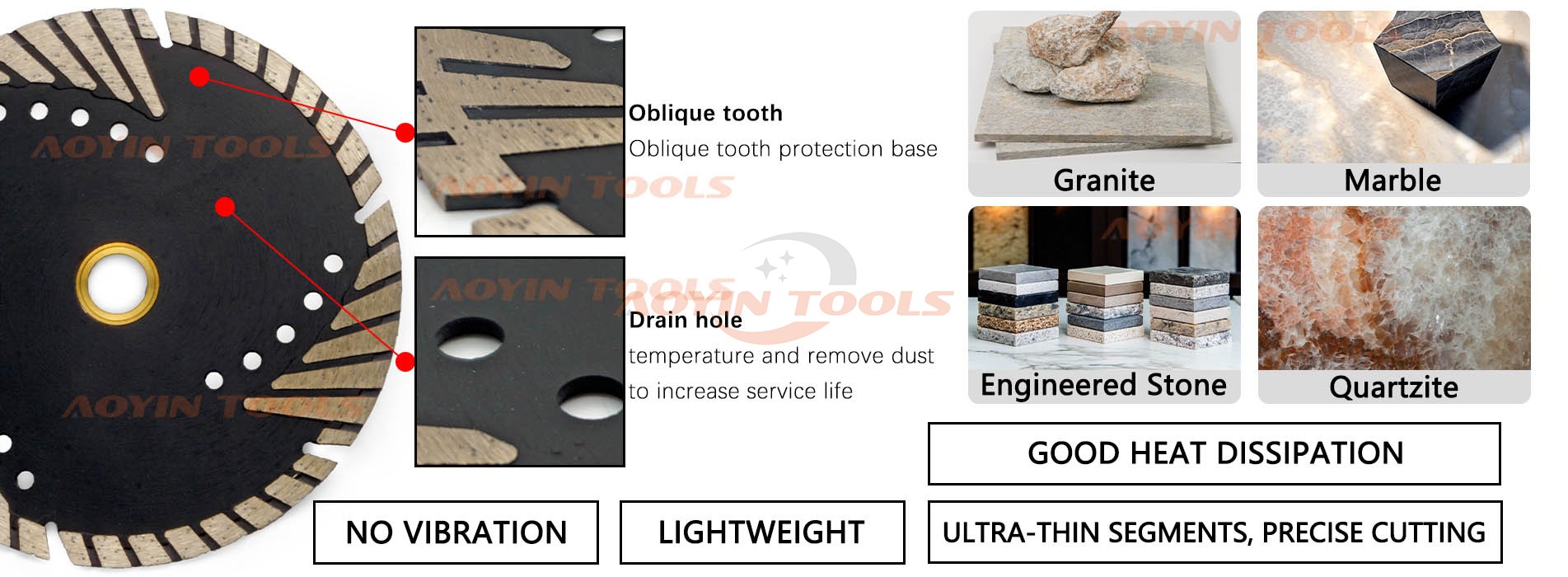 Lâmina diamantada turbo com dentes de proteção triangular no núcleo para granito e mármore.